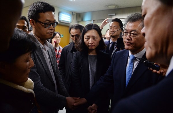 문재인 새정치민주연합 대표와 이종걸 원내대표, 주승용, 정청래, 유승희 최고위원 등 지도부가 20일 오전 서울 종로구 연건동 서울대병원을 찾아 '민중총궐기' 집회 중 경찰의 물대포에 맞아 중태에 빠진 백남기 씨 가족들을 위로하고 대화를 나누고 있다. (사진=공동취재단)