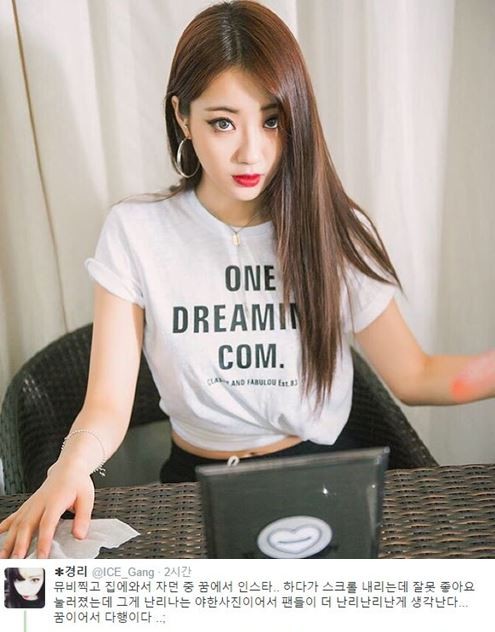나인뮤지스 경리는 22일 자신의 SNS를 통해 "뮤비 찍고 자던 중 꿈에서 인스타 하다가 스크롤 내리는데 잘못 좋아요 눌러졌는데 그게 난리나는 야한 사진이어서 팬들이 더 난리난리난게 생각난다..꿈이어서 다행이다"라는 글을 게재했다.