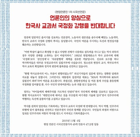 앞서 전국 49개사에 속한 4,713명으로부터 동의를 얻은 언론노조는 지난 3일 '현업 언론인 1차 시국선언문'을 발표하며, "역사를 권력의 입맛대로 기록하려는 '한국사 교과서 국정화'에 반대한다"는 입장을 밝혔다. 이튿날에는 전국단위 종합일간지에 같은 내용의 의견 광고가 게재됐다.