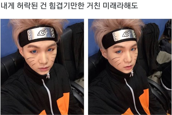 한 커뮤니티에는 '방탄소년단 슈가 나루토 분장'이라는 제목과 함께 사진 두 장이 게재되었다. 공개된 사진 속 방탄소년단의 슈가는 파란색 렌즈를 끼고 애니 '나루토'의 주인공 나루토를 코스프레하며 이목을 집중시켰다.