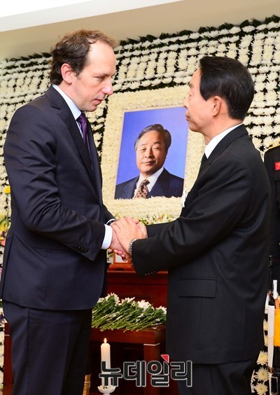 파비앙 페논 주한 프랑스대사가 25일 서울 종로구 서울대학병원 장례식장에 마련된 故 김영삼 전 대통령 빈소에서 조문을 마친 후 김현철씨와 인사를 하고 있다. <사진=사진공동취재단>