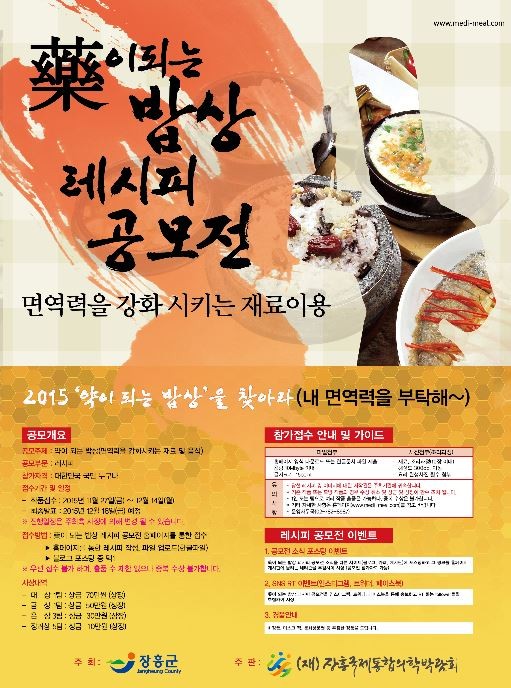 장흥국제통합의학박람회 조직위원회(위원장 김성 장흥군수)는 최근 발병해서 사회적으로 큰 파장을 몰고 온 메르스 등 전염병의 원인이 바로 면역력 약화라는 점을 감안해 이를 널리 알리고 예방 치료할 수 있는 '藥(약)이 되는 밥상 레시피 공모전'을 개최한다고 밝혔다.
