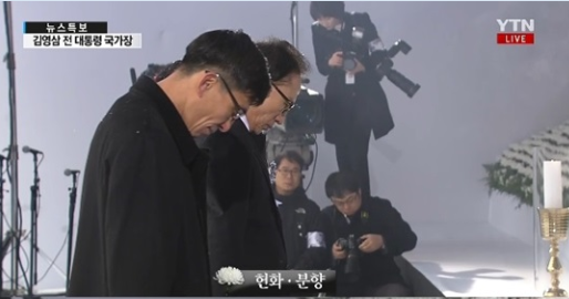 이 전 대통령과 김 여사는 눈발이 날리는 궂은 날씨에도 야외에서 진행된 영결식 자리에 나란히 앉아 YS의 서거를 애도했다. 앞서 이 전 대통령은 지난 22일 김영삼(YS) 전 대통령의 빈소가 마련됐던 서울대병원을 찾아 명록에 "삼가조의를 표합니다"라는 글을 남겼다. -