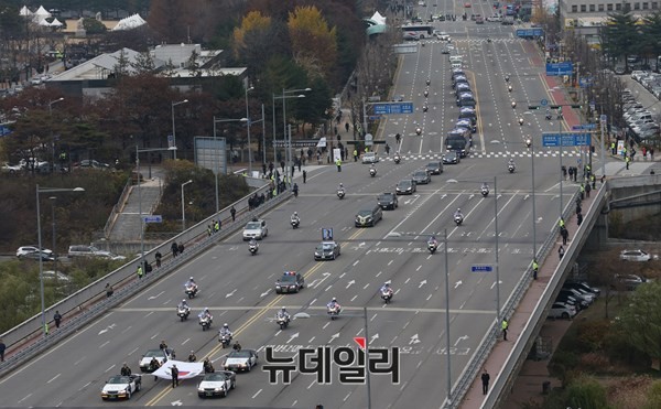 故 김영삼 전 대통령 영결식이 26일 오후 2시 서울 여의도 국회의사당에서 국가장으로 엄수된 가운데 운구 행렬이 국회를 나서 상도동으로 향하고 있다.