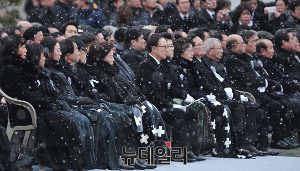 26일 서울 여의도 국회에서 엄수된 故 김영삼 전 대통령 국가장 영결식에서 김 대통령 차남 현철씨 등 참석 인사들이 행사를 바라보고 있다.
