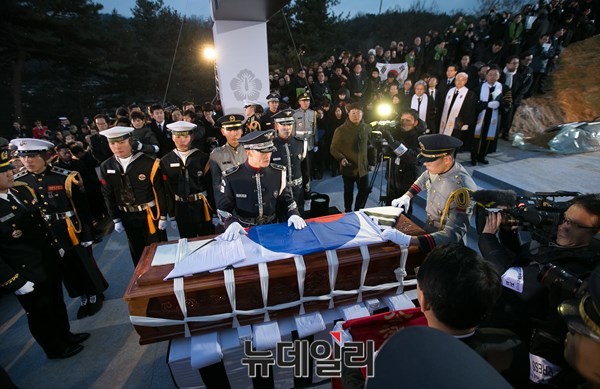 故 김영삼 전 대통령의 안장식이 열린 26일 오후 서울 동작구 국립현충원에서 故김 전 대통령의 관이 하관되고 있다. /사진공동취재단