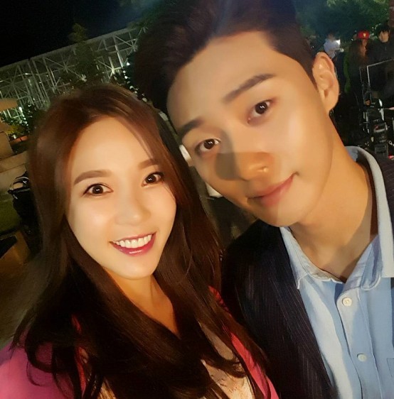 공개된 사진 속 레이양은 배우 박서준과 함께 밀착하여 밝은 모습으로 카메라를 응시하고 있다.