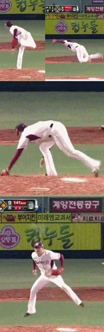 한 커뮤니티에는 '손승락 투구폼'이라는 제목과 함께 영상 한 편이 게재되었다. 게재된 영상 속 손승락은 힘껏 공을 던짐과 동시에 몸통을 한바퀴 돌아 가볍게 착지하는 모습이 담겨있다.