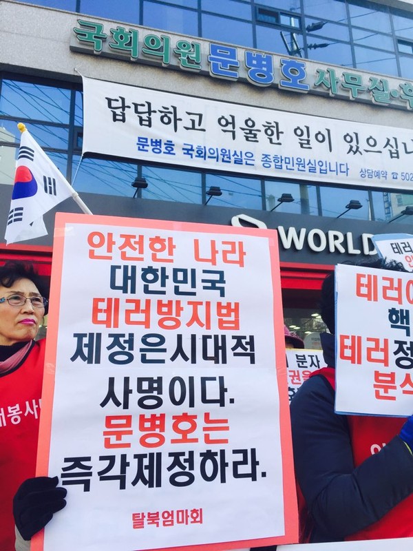 30일 엄마부대봉사단 정예 멤버들은 나라지키기운동본부, 탈북엄마회, 학부모엄마회, 정의로운 시민행동 등 다수 애국단체 회원들과 함께 인천 부평구에 위치한 새정치민주연합 문병호 의원 사무실 앞에 집결, 테러방지법 통과를 촉구하는 기자회견을 열었다.