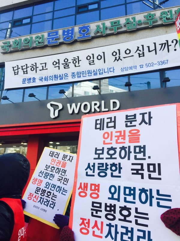 엄마부대의 기자회견을 보고, 밖으로 뛰쳐나온 문 의원실 관계자는 "원하는 뜻이 있다면 국회의원실에 와서 정식으로 통과시켜 달라고 해야한다"면서 "이런 식의 시위는 흠집내기에 불과하다"고 회견 중단을 요청했다.우리 의원님이 테러방지법을 반대하는게 아니라, 찬성을 하되, 국정원에 힘을 줘서는 안된다는 논리입니다. 그렇다면 일반인들도 마스크를 쓰고 돌아다니지도 못합니다. 그리고 "(문병호 의원)뽑지 마세요" 이런 말을 하면 안되지요. "협조부탁드립니다" 이렇게 나와야지요.