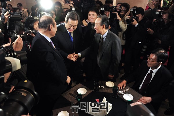 30일 서울 여의도 중소기업중앙회에서 열린 민주화추진협의회 송년모임에서 김무성 새누리당 대표가 상도동계 의원들과 인사를 하고 있다.