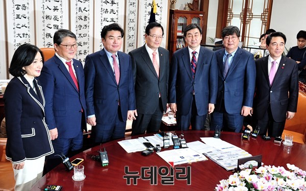 정의화 국회의장과 새누리당 원유철-새정치민주연합 이종걸 원내대표 등 여야 지도부가 2일 오후 서울 여의도 국회 의장실에서 열린 예산안 관련 회동에서 기념사진을 찍고 있다.