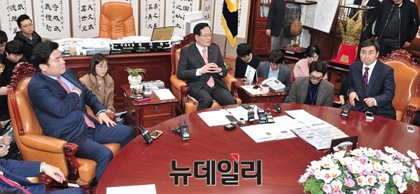 정의화 국회의장과 새누리당 원유철-새정치민주연합 이종걸 원내대표 등 여야 지도부가 2일 오후 서울 여의도 국회 의장실에서 열린 예산안 관련 회동에서 대화를 나누고 있다.