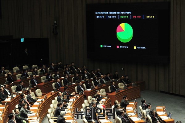 2016년도 예산안 처리를 위한 마지막 날을 하루 넘긴 3일 오전 서울 여의도 국회 본회의장에서 내년도 예산안 개정안이 본회의를 통과하고 있다.