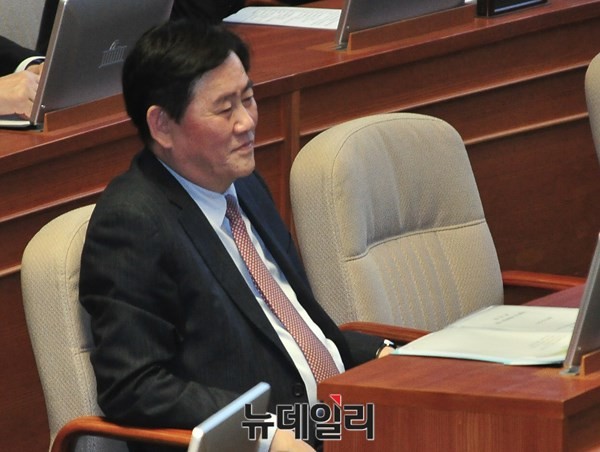 2016년도 예산안 처리를 위한 마지막 날을 하루 넘긴 3일 오전 서울 여의도 국회 본회의장에서 내년도 예산안 개정안이 본회의를 통과하자 최경환 경제부총리 겸 기획재정부 장관이 미소를 짓고 있다.