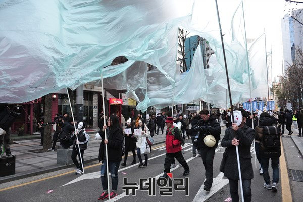 [포토] 가면으로 얼굴 가리고 행진하는 시위대