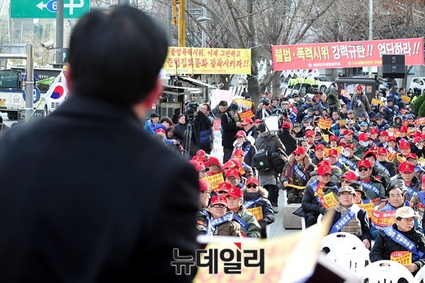 대한민국재향경우회 가 5일 오후 서울 광화문 동화면세점 앞에서 전국 경우회원, 애국안보단체원 등 애국시민 1000여 명과 함께 제2차 민중총궐기대화를 규탄하는 국민대회를 갖고 있다.