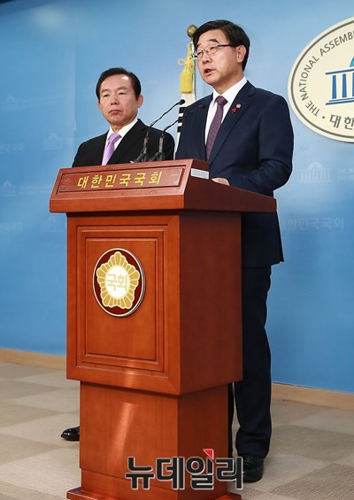 이기권 고용노동부장관과 새누리당 이인제 노동시장선진화특별위원회 위원장이 7일 오전 서울 여의도 국회 정론관에서 노동개혁 5대 입법의 처리를 호소하고 있다.