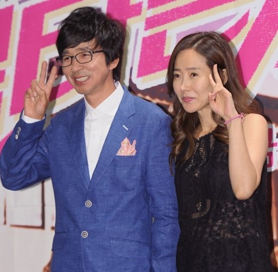 이 날 강수지는 블랙컬러의 레이스소재의 슬리브리스 의상을 입고 나와 김국진과 함께 V자 포즈를 취하고 있다.