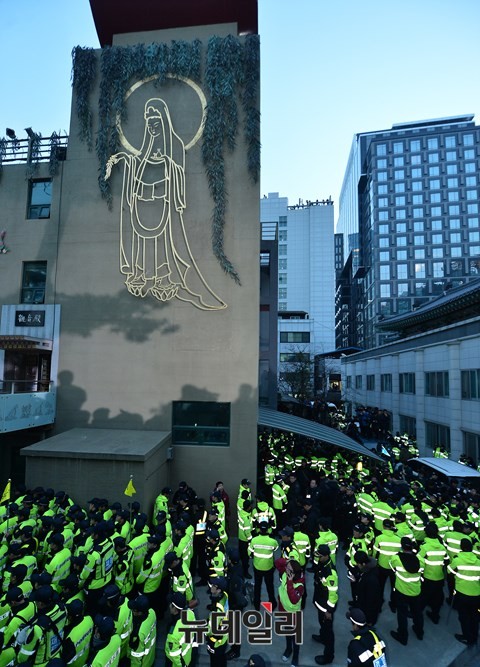 한상균 민주노총위원장 체포영장 집행 시간이 가까워 온 9일 오후 조계사 입구는 일반인 출입이 제한됐다. 앞서 조계사 측은 오후 2시 20분께 한 위원장이 은신해 있는 관음전 건물과 조계사 경내를 연결하는 다리를 해체했다.