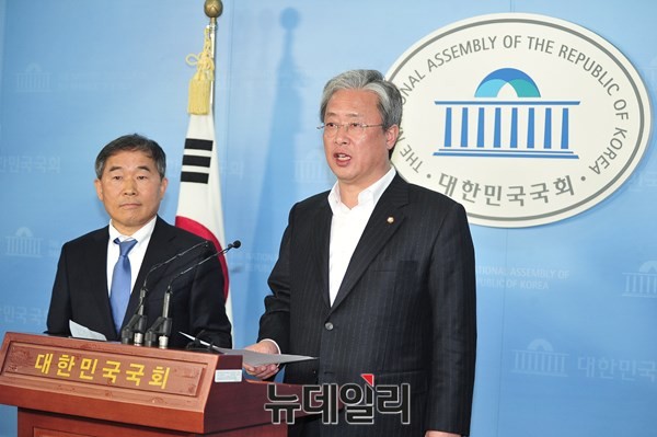 새정치연합 유성엽 의원과 황주홍 의원이 9일 오전 서울 여의도 국회 정론관에서 문재인 대표의 사퇴와 징계를 촉구하고 있다.
