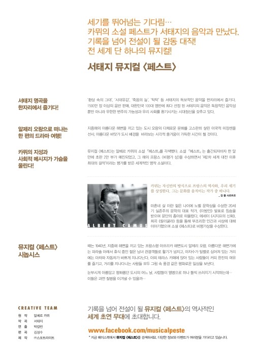 한편, 주한 프랑스 문화원은 프랑스를 대표하는 작가이자 실존주의 문학의 선구자인 알베르 카뮈의 소설을 원작으로 한 만큼 뮤지컬 '페스트'의 후원사로 참여하기로 결정했다. 무엇보다 2016년은 한불수교 130주년을 맞는 해로서 그 의미가 더욱 남다르다.