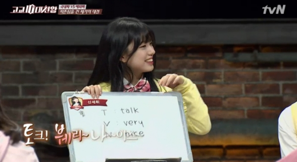 신세휘, 완벽한 그녀에게 딱 한가지 부족한 것?방송인 신세휘가 SBS 예능프로그램 '런닝맨'에 출연해 화제를 모으고 있다. 이 가운데 신세휘의 과거 방송서 재치있는 발언이 다시금 주목받고 있다.신세휘는 과거 방송된 tvN '고교10대천왕'에 출연해 영어 울렁증 극복의 일환으로 tvN 삼행시 짓기 미션을 했다.이날 신세휘는 삼행시를 "토크, 베리, 나이스"라고 말했다. 다른 해외파 학생들에 비해 영어 실력을 떨어졌지만, 귀엽게 발음하는 그녀의 모습에 남자 출연자들은 "예쁘다"를 남발하며 칭찬했다.한편 신세휘는 지난 4월 첫 방송된 tvN 예능프로그램 '고교10대천왕' 에서 한효주 닮은꼴로 눈길을 끌었다.