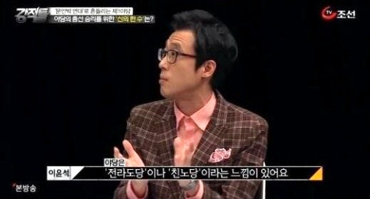 다음은 개그맨 이윤석의 관련 발언 전문이윤석 = 저는 무당파고, 중도파고, 지지하는 정당이 없어요. 그럼에도 불구하고 우러나오는 대로 말씀을 드리다면 보수적이지만 현재 보수당에 만족하지 않는 사람들이 야권을 지지하지 못하는 이유 중 하나는 전라도당이나 친노당이라는 느낌이 있어요. 너무 오래됬어요 그 이미지가 저처럼 정치에 별로 관심이 없던 사람들은 기존에 있었던 정치인하면 일단 싫거든요.