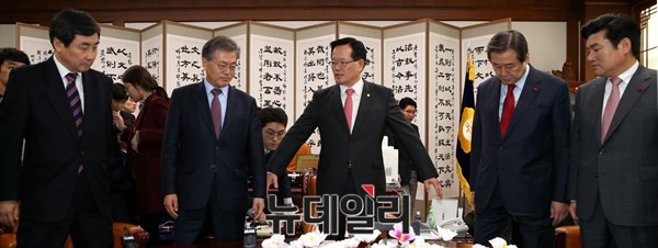 • 정의화 국회의장이 15일 오전 의장실에서 김무성 새누리당 대표와 문재인 새정치민주연합 대표 간의 선거구 획정과 관련 협상을 중재하기에 앞서 기념사진을 촬영하고 있다.