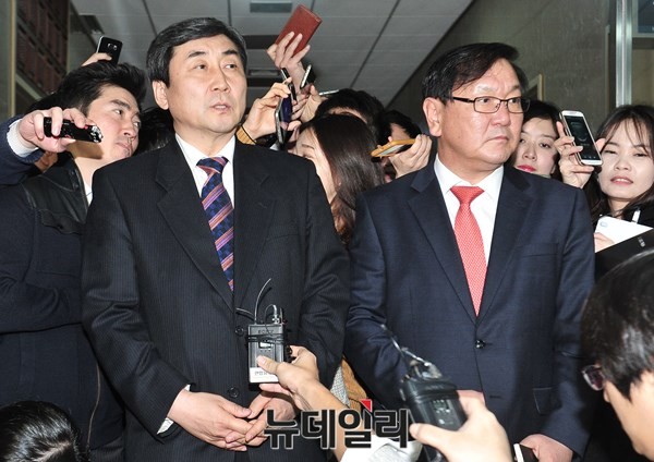 새정치민주연합 이종걸 원내대표와 김태년 정개특위 간사가 15일 오후 국회의장실에서 열린 선거구 획정 관련 여야 회동이 파행으로 끝나자 의장실을 빠져나와 기자들의 질문에 답하고 있다.