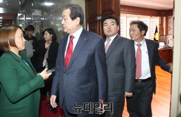 새누리당 김무성 대표와 원유철 원내대표가 15일 오후 국회의장실에서 열린 선거구 획정 관련 여야 회동이 파행으로 끝나자 의장실을 빠져 나가고 있다.