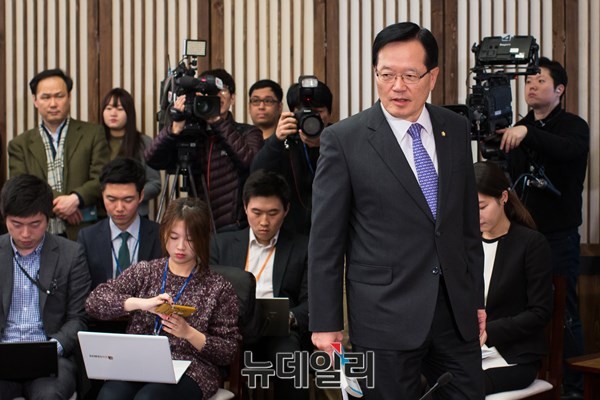 정의화 국회의장이 16일 오전 서울 여의도 국회 의장접견실에서 열린 기자간담회장에 입장하고 있다.