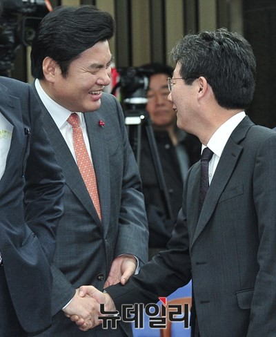 원유철 원내대표와 유승민 전 원내대표가 16일 오전 서울 여의도 국회에서 열린 새누리당 의원총회에서 대화를 나누고 있다.