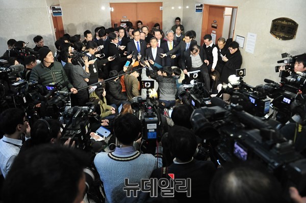 새정치민주연합 문병호, 유성엽, 황주홍 의원이 17일 오전 서울 여의도 국회 정론관에서 탈당 선언 기자회견을 마친 후 기자들의 질문에 답하고 있다.