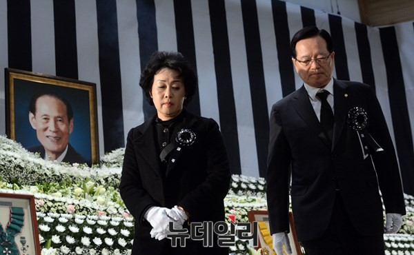17일 오전 서울 여의도 국회 의원회관에서 열린 故 이만섭 국회의장 국회장 영결식에 참석한 정의화 국회의장이 부인과 함께 헌화를 하고 내려오고 있다.