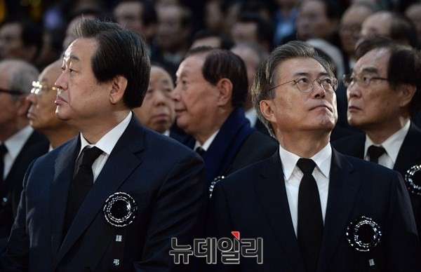 17일 오전 서울 여의도 국회 의원회관에서 열린 故 이만섭 국회의장 국회장 영결식에 참석한 새누리당 김무성 대표와 새정치민주연합 문재인 대표가 서로 다른 모니터로 조총식 영상을 시청하고 있다.