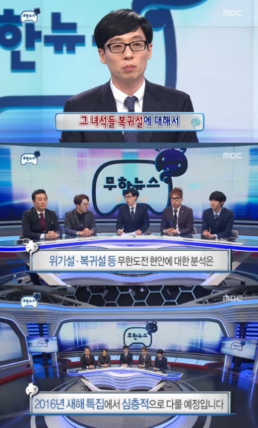 제작진은 '무한도전' 자막을 통해 "위기설 복귀설 등 '무한도전' 현안에 대한 분석은 2016년 새해 특집에서 심층적으로 다룰 예정"이라고 밝혔다.