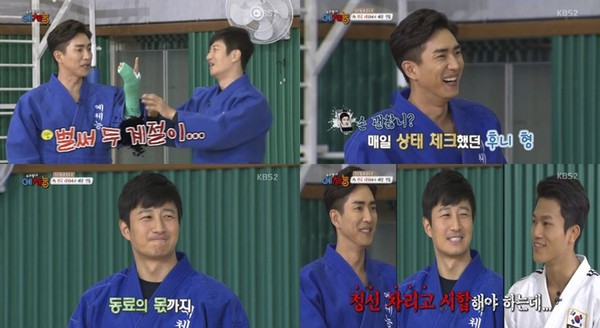 이날 고세원이 왼손에 깁스를 하고 등장하자 이훈은 깁스를 한 고세원의 손을 살피며 전전긍긍하는 모습을 보였다.
