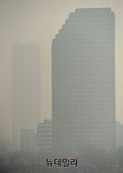 경기 북부에 미세먼지주의보가 발령된 24일 오전 서울 서강대교 남단에서 바라본 여의도 LG트윈타워와 63시티가 짙은 미세먼지 농도로 흐리게 보인다. 서강대교에서 LG트윈타워까지 직선거리는 1km, 63시티까지 직선거리는 2.2km이다.
