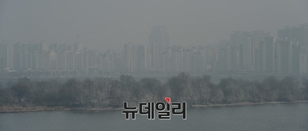 경기 북부에 미세먼지주의보가 발령된 24일 오후 서울 서강대교 남단에서 바라본 마포구 일대와 밤섬이 짙은 미세먼지농도로 흐릿하게 보인다.