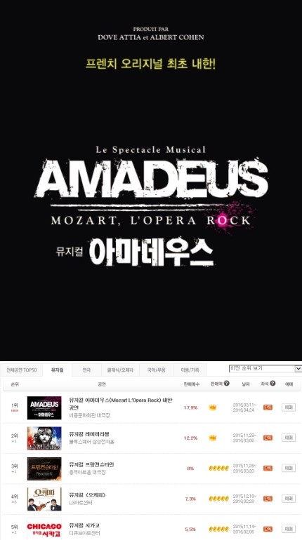 아시아 최초로 프렌치 오리지널 내한공연을 갖는 뮤지컬 '아마데우스'가 티켓 오픈과 동시에 예매순위 1위에 올랐다.28일 오후 2시 티켓을 오픈한 뮤지컬 '아마데우스'는 30분 만에 인터파크에서 예매율 17.9%(12월 28일 오후 2시30분 기준)를 기록하며 '레미제라블', '프랑켄슈타인' 등 연말 대작들을 제치고 예매랭킹 1위를 차지했다.이는 2015 관객 선정 다시 보고 싶은 뮤지컬 1위, 내한공연의 확정 등으로 뮤지컬 '아마데우스'를 기다려 온 관객들의 뜨거운 성원에 힘입은 것으로 보인다.뮤지컬 '아마데우스'는 천재 음악가 볼프강 아마데우스 모차르트의 인간적인 고뇌를 세밀하게 묘사한 작품. 새로운 후원자 콜로레도 대주교의 억압을 견디지 못하고 모차르트가 음악여행을 떠나는 시점부터 시작해 사랑, 절망, 성공, 죽음에 이르는 순간까지를 그렸다.클래식과 락 음악의 완벽한 조화로 지금까지 재해석된 모차르트의 음악 중 가장 높은 평가를 받고 있으며, 2016년 3월 11일부터 4월 24일까지 세종문화회관 대극장에서 공연한다.[사진=마스트엔터테인먼트]