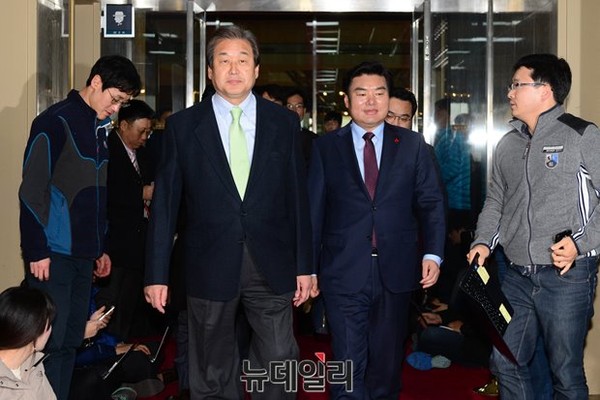 정의화 국회의장과 여야 지도부가 27일 여의도 국회 의장 집무실에서 회동을 갖고 내년 4·13 총선 선거구 획정안과 쟁점법안을 놓고 막판 조율에 나섰다. 김무성 새누리당 대표와 원유철 원내대표가 국회의장실로 향하고 있다.