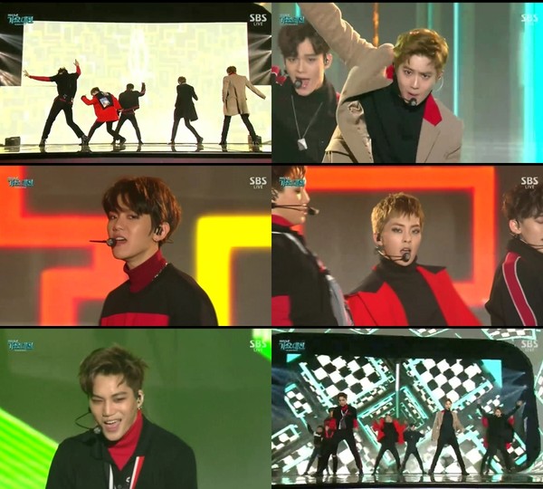 그룹 엑소가 'Call Me Baby'와 'Love Me Right'로 무대를 꾸며 팬들의 시선을 사로잡았다.엑소는 27일 오후 방송된 ‘2015 SBS 가요대전(이하 가요대전)’에 출연해 강렬한 퍼포먼스와 귀여운 춤으로 상반된 매력을 선보였다.이날 엑소는 'Call Me Baby'무대에서 격렬한 춤으로 '상남자'의 매력을 뿜어냈다. 특히 무대 처음과 중간, 특별 퍼포먼스를 삽입해 새로운 볼거리도 제공했다.엑소는 'Love Me Right' 무대에서 귀여운 춤과 표정으로 여심을 흔들는 무대를 마련했다. 특히 붉은 색과 검은색으로 포인트를 준 옷들이 이목을 집중시켰다.한편 ‘가요대전’은 총 2부로 진행됐으며 티아라, 씨엔블루, 아이콘, 에일리, 종현, 원더걸스, 엑소 첸, 엑소 백현, 샤이니 태민, 몬스타엑스, B.A.P, 여자친구, 빅스, AOA, 비투비, 포미닛, 인피니트, 엑소, 샤이니, 소녀시대가 출연했다.