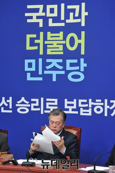 더불어민주당 문재인 대표가 30일 오전 서울 여의도 국회 당대표 회의실에서 열린 최고위원회의에 참석해 자료를 검토하고 있다.