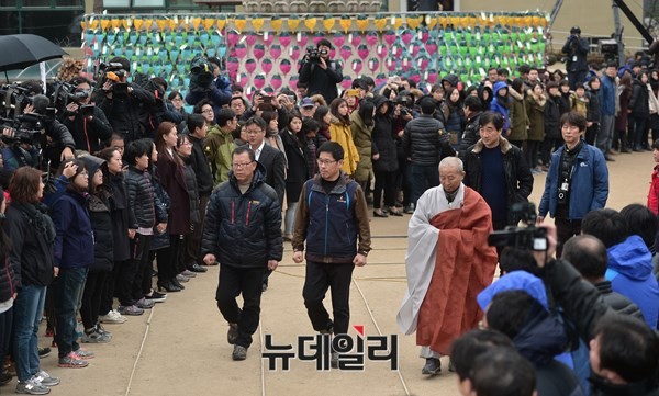 조계사로 은신한 한상균 민주노총위원장이 은신 24일 만인 12월 10일 오전 조계사에서 관음전에서 나와 화쟁위원장인 도법스님과 대웅전으로 향하고 있다.(정상윤 기자)