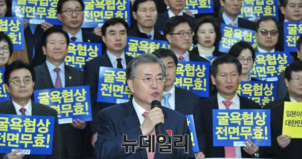 더불어민주당 문재인 대표와 소속 의원들이 31일 오전 서울 여의도 국회 로텐더홀에서 [굴욕협상 전면무효]라는 피켓을 들고 한일 정부의 위안부 협상 타결을 규탄하고 있다.