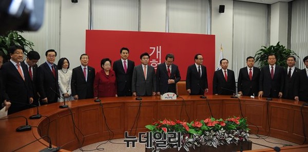 새누리당 김무성 대표와 원내대표를 비롯한 최고위원들이 4일 오전 서울 영등포구 여의도 국회에서 열린 새해 첫 최고위원회의에 참석해 인사를 하고 있다.