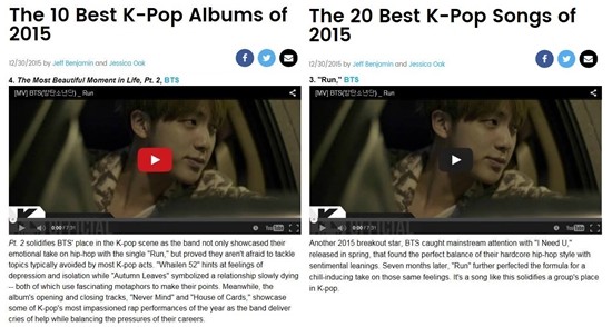 그룹 방탄소년단의 신곡 ‘RUN’이 빌보드 ‘2015 베스트 K-POP 앨범 10’과 ‘2015 베스트 K-POP 노래 20’에서 각각 4위와 3위로 선정(2015년 12월 30일 기준)됐다.빌보드의 이번 2015년 베스트 K-POP 앨범과 노래 순위에서 동시에 이름을 올린 것은 방탄소년단이 유일하다.빌보드는 방탄소년단의 ‘화양연화 pt.2’를 2015년 최고의 앨범으로 선정한 데 대해 “타이틀곡 ‘RUN’을 통한 힙합과 감성의 결합을 보여주었을 뿐 아니라 다른 K-POP 가수들이 일반적으로 회피하는 주제에 대해 전면적으로 부딪히는 것을 두려워하지 않는다는 점을 증명해냄으로써 K-POP 신에서의 방탄소년단의 위치를 확고히 했다”고 설명하며 ‘Whalien 52’를 비롯해 ‘고엽’ 등 앨범의 다른 수록곡에 대해서도 호평했다.또한 ‘RUN’에 대해서는 “봄에 발표한 ‘I NEED U’는 거친 힙합 스타일과 감상적인 성향의 완벽한 조화를 선보였다. 7개월 후 발표한 ‘RUN’은 이러한 감정들을 좀 더 편안하게 소화해낸 더욱 완벽한 곡이었다. K-POP에서의 방탄소년단의 위치를 굳건히 한 노래”라고 평했다.앞서 방탄소년단의 ‘화양연화 pt.2’는 빌보드 메인 앨범 차트인 빌보드200에 171위로 진입하는 쾌거를 이뤄낸 바 있다. 현재까지 ‘화양연화 pt.2’의 누적 판매량은 27만 장에 달하고 있어 국내외적으로 폭발적인 인기를 보이고 있는 방탄소년단의 글로벌 파워를 확인할 수 있다.