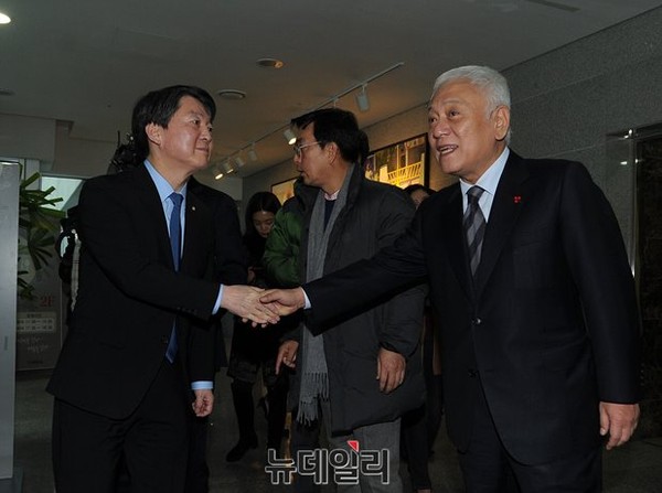 김한길 안철수 무소속 의원이 7일 서울 여의도 국회 의원회관에서 오찬회동을 마친 후 악수를 나누고 있다.