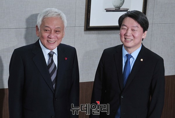 김한길-안철수 무소속 의원이 7일 오전 서울 여의도 국회 의원회관에서 열린 오찬회동에서 대화를 나누고 있다. 이날 김한길-안철수 의원은 신당 창당 발기인에 함께 하기로 했다.